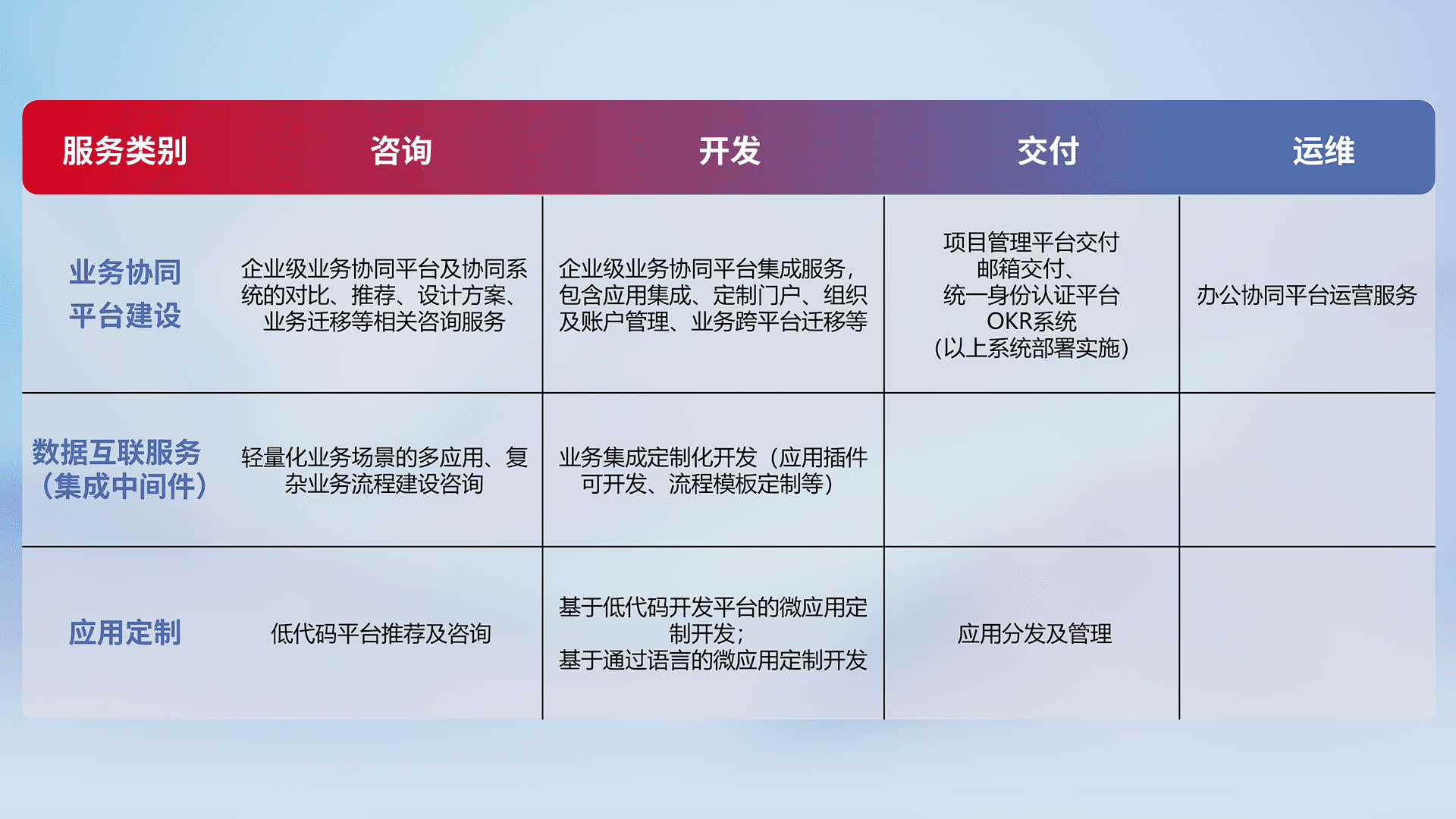 针对钉钉、、、企微、、、IDaas等平台级产品提供产品的规划、、、方案、、、、交付、、定制化开发等服务,,,,实现如统一协同办公、、、、智能客户服务、、、、混合会议管理、、智能数据查询、、、、等业务场景,,,,实现数字化转型。。
