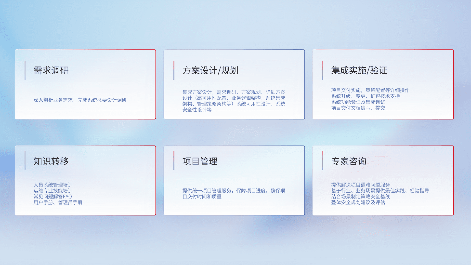 针对客户行业特性,,,,将宏观的安全战略和需求,,通过专业的交付服务,,,,实现项目落地,,为客户提供标准规范的集成交付服务。。。